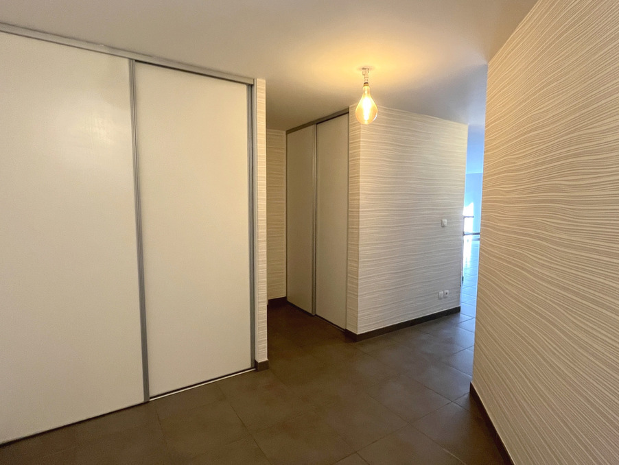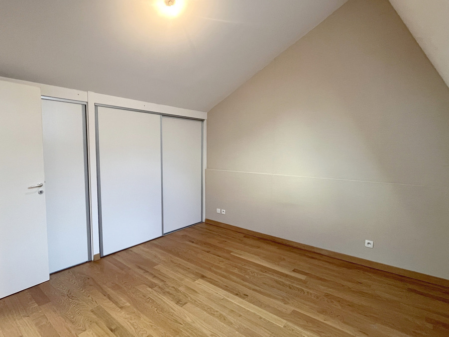En demi-niveau, un espace mezzanine surplombe le séjour et donne accès à une première chambre avec placards.