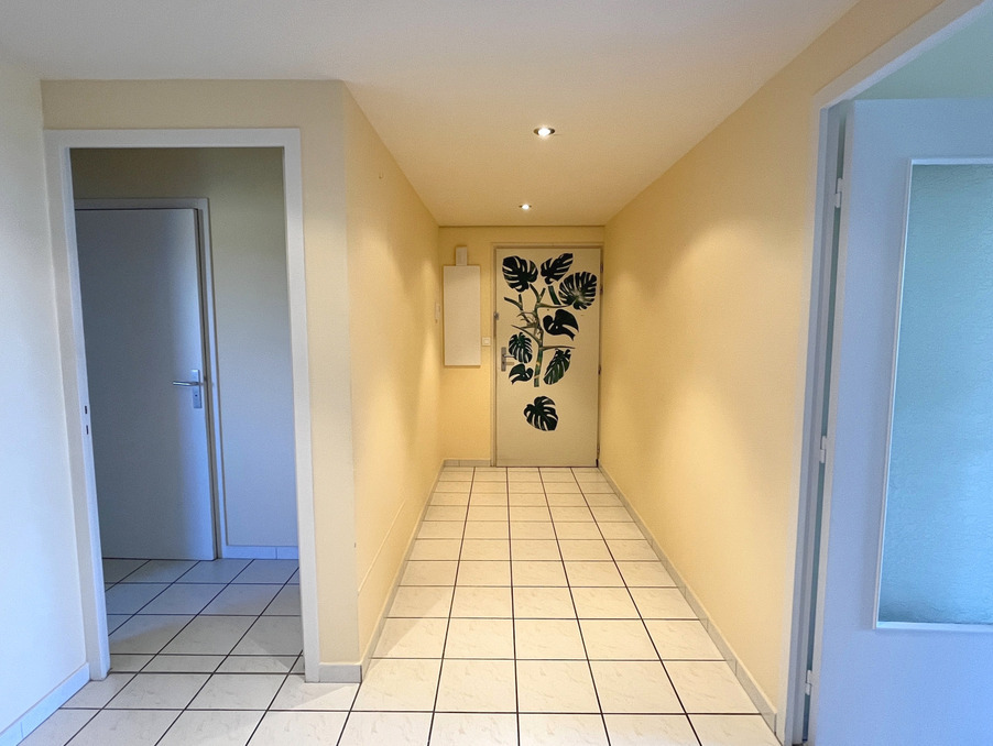 Au premier niveau, l'entrée dessert une cuisine aménagée donnant sur le balcon (aussi accessible par le séjour), le séjour, 3 chambres, une salle de bains, un WC et un débarras.